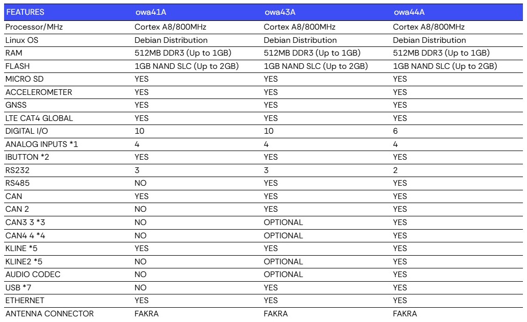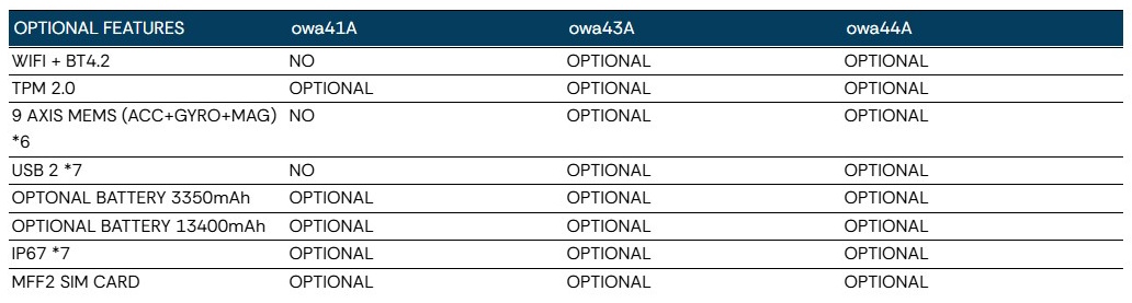 This table is only an HTML5 version of the official BOK 100 9001 owa4x family variants & options summary, available on the documentation section of the owa4x IoT gateway.